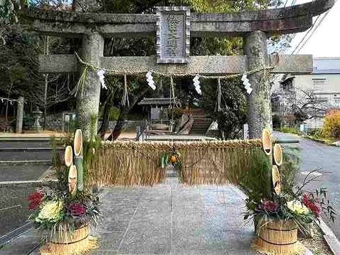 近所の氏神様(熱田神社)の鳥居なんですが、門松と門松の間に暖簾みたいなのがあるでしょ?