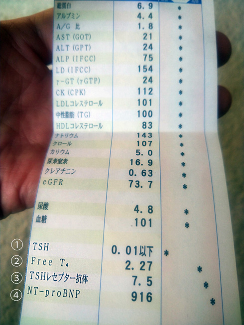 ①~④が甲状腺機能を示す項目だそうで、やはりこれらが標準から外れている=頻脈の原因はこれじゃないかということでした。