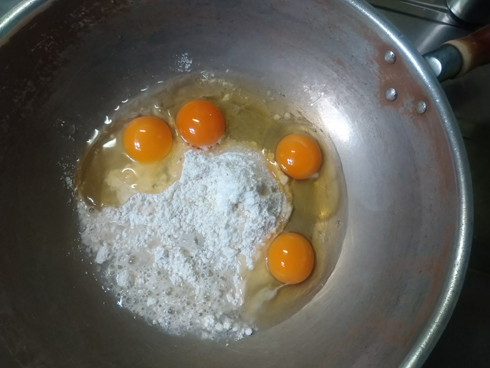 卵入れる前に水少々で粉を溶いておかないとダマになる、この基本を無視したらこうなるというとてもいい失敗例ですw